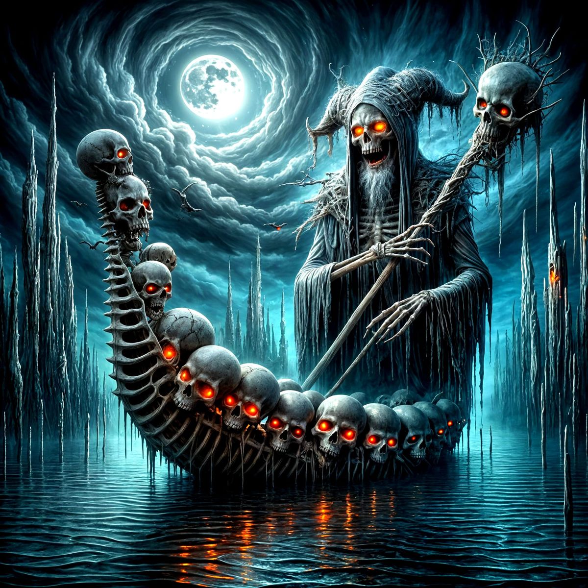 This image shows a chilling court jester in a surreal, moonlit landscape of blues and grays. The skeletal jester stands in a boat made of bones on shadowy water, rendered with ominous detail.