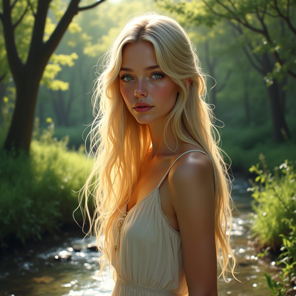 This image features a stunningly beautiful young woman with long blonde hair and blue-green eyes, standing in a serene woodland setting. The art style blends detailed acrylic and pencil work with cinematic lighting.