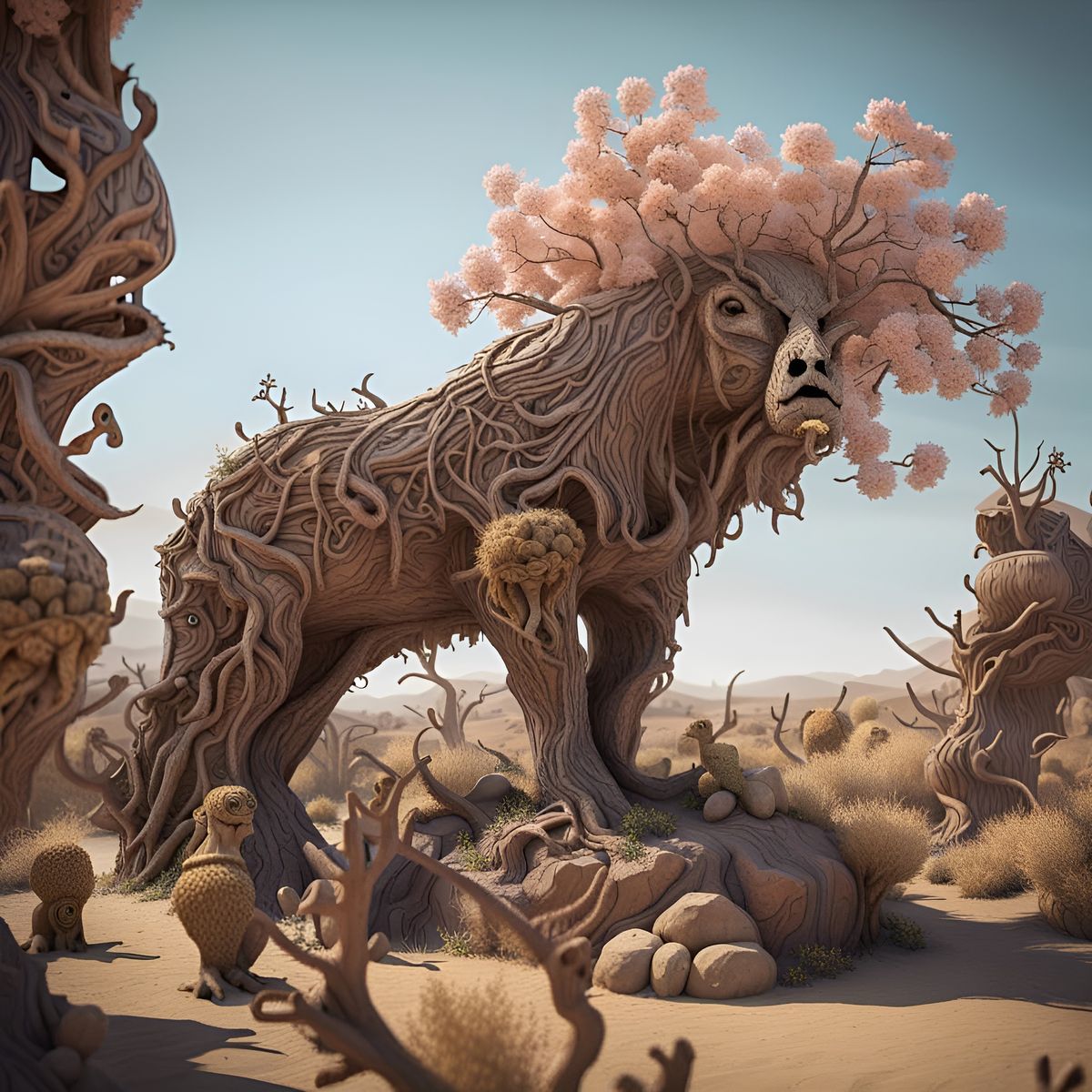 This image shows a surreal museum installation. It features a flowering tree atop an animal graveyard in the desert, realized as papier-mâché art with fine design details. The piece is rendered with beautiful lighting.