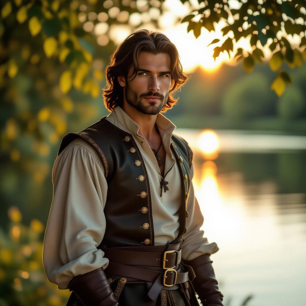 This image shows a man in medieval clothing standing serenely. Sunlight filters through the trees, creating a warm glow. The style is reminiscent of historical paintings, with hyperrealistic detail and soft lighting.