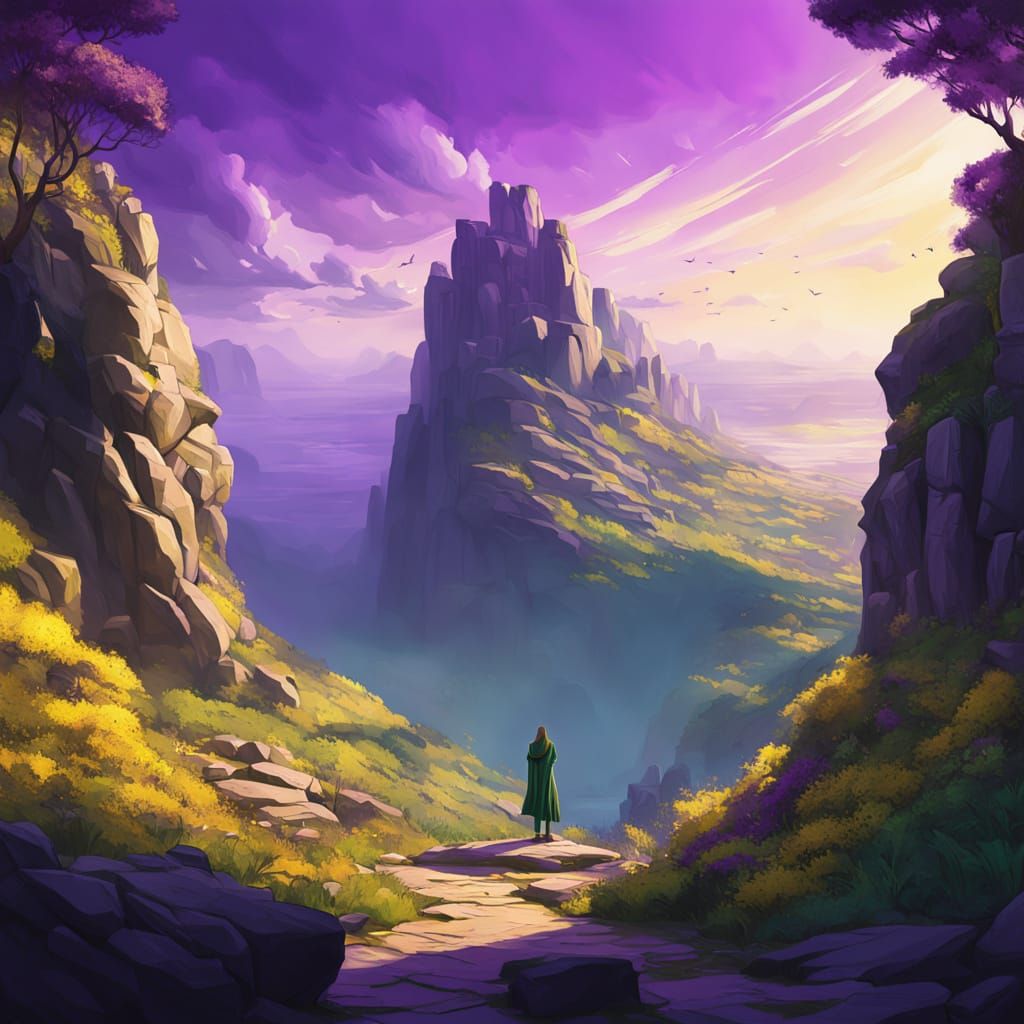 A vibrant fantasy illustration of a girl in a green cloak standing on a rocky cliff, looking out over a thriving landscape. This digital painting features expressive brushstrokes and dynamic lighting.