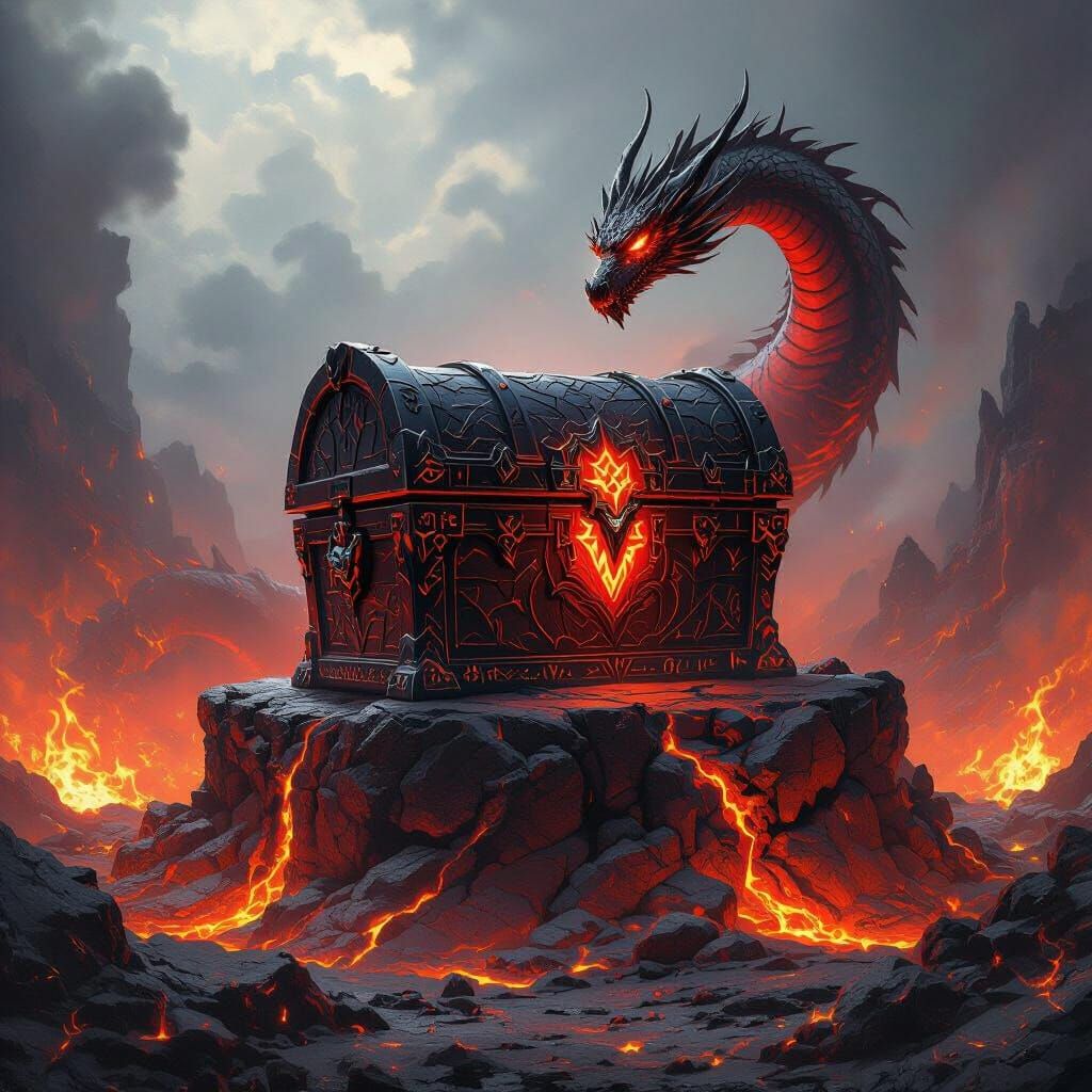 A striking picture of an obsidian treasure chest with glowing runes, set on a black rock pedestal and encircled by molten lava. A spectral dragon coils around it in this dark fantasy concept art.