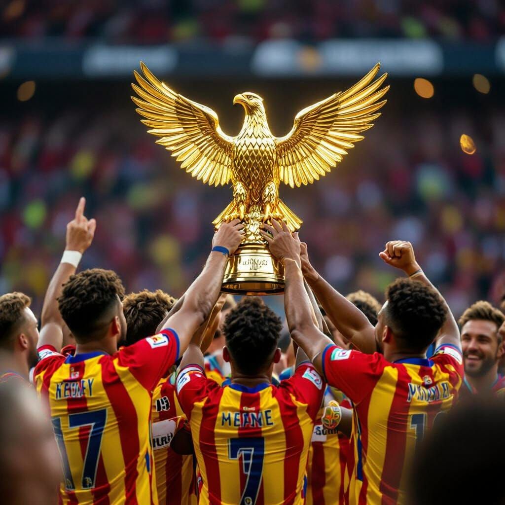 Photorealistic image of footballers in striped yellow and red shirts holding an eagle trophy. Captured from a distance with cinematic, shallow depth of field and golden hour lighting.