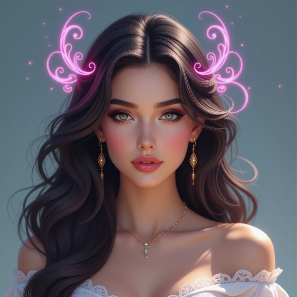 This image shows a stunning woman with long, flowing hair accented by neon glyphs. She has an intense gaze and is bathed in soft, diffused light, wearing elegant clothing in a hyperrealistic digital art style.