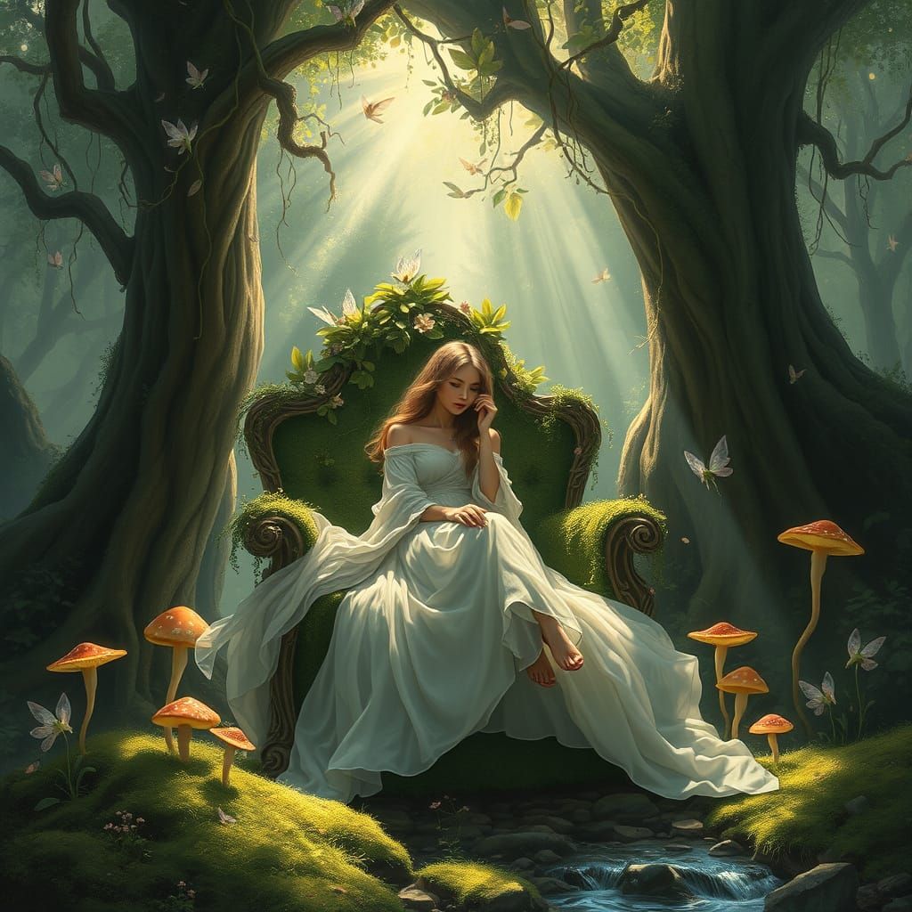A hyperrealistic painting depicts a serene woman on a mossy throne in an ancient forest, surrounded by glowing pixies and mushrooms, rendered with luminism and warm colors.
