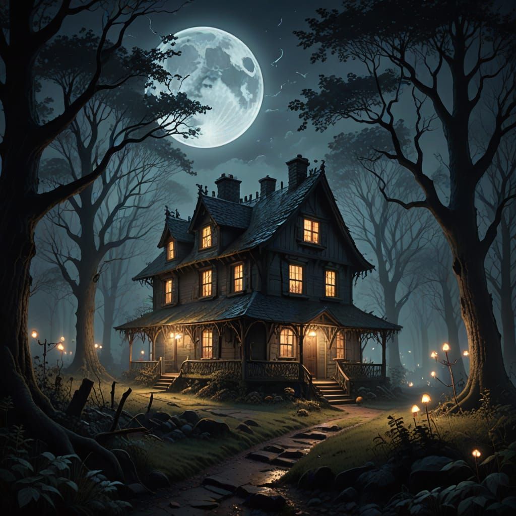 This enchanting image captures a mystical cottage scene at night, bathed in the soft, ethereal glow of luminescent mushrooms and the shimmering light of the full moon, set amidst a misty atmosphere with twisted trees looming in the shadows.