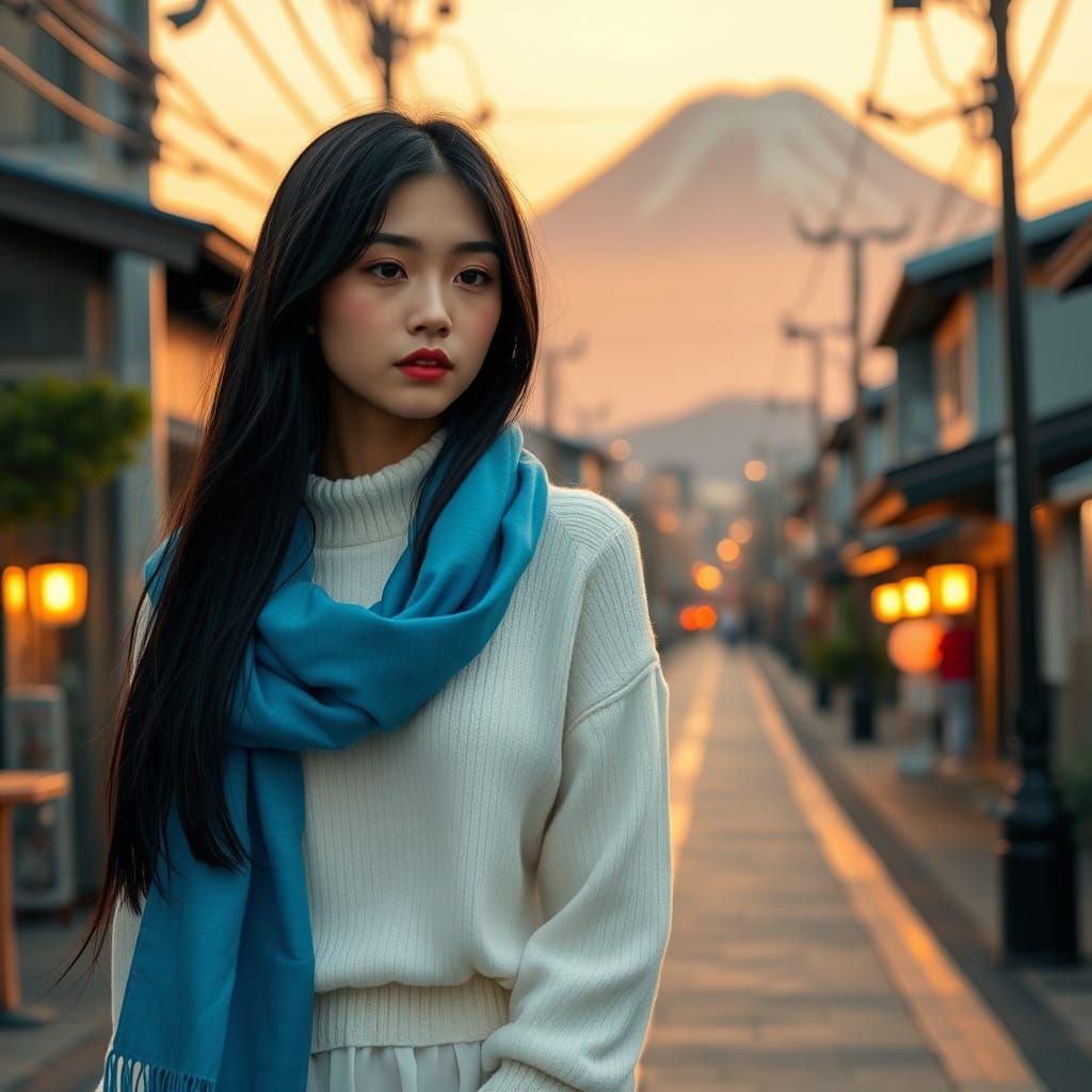 This image shows a serene Japanese woman standing on a sidewalk in a quaint town, surrounded by a romantic, dreamy atmosphere, with Mt. Fuji rising in the background and a soft, golden light of sunset.