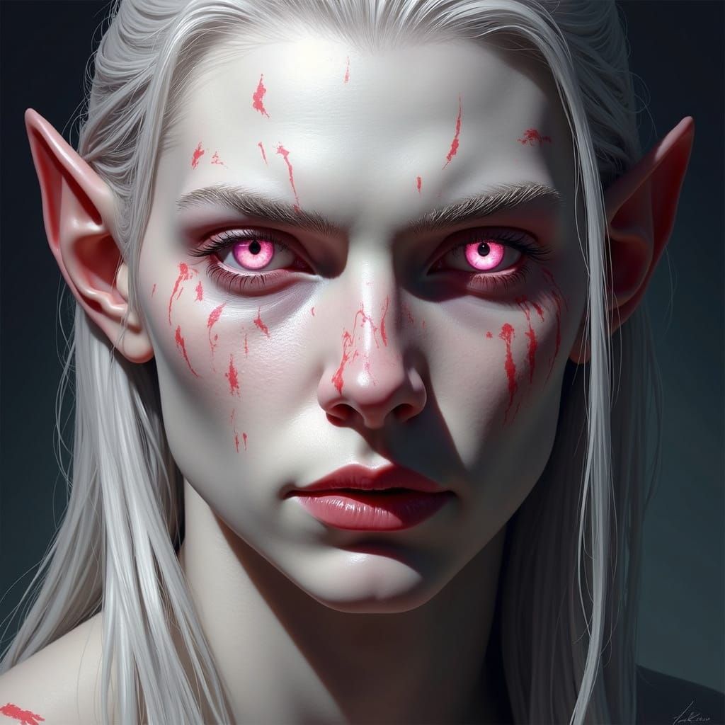 A haunting image of a half ork man with piercing pink eyes and pale skin, set in a dark cyberpunk world with a sense of foreboding menace.