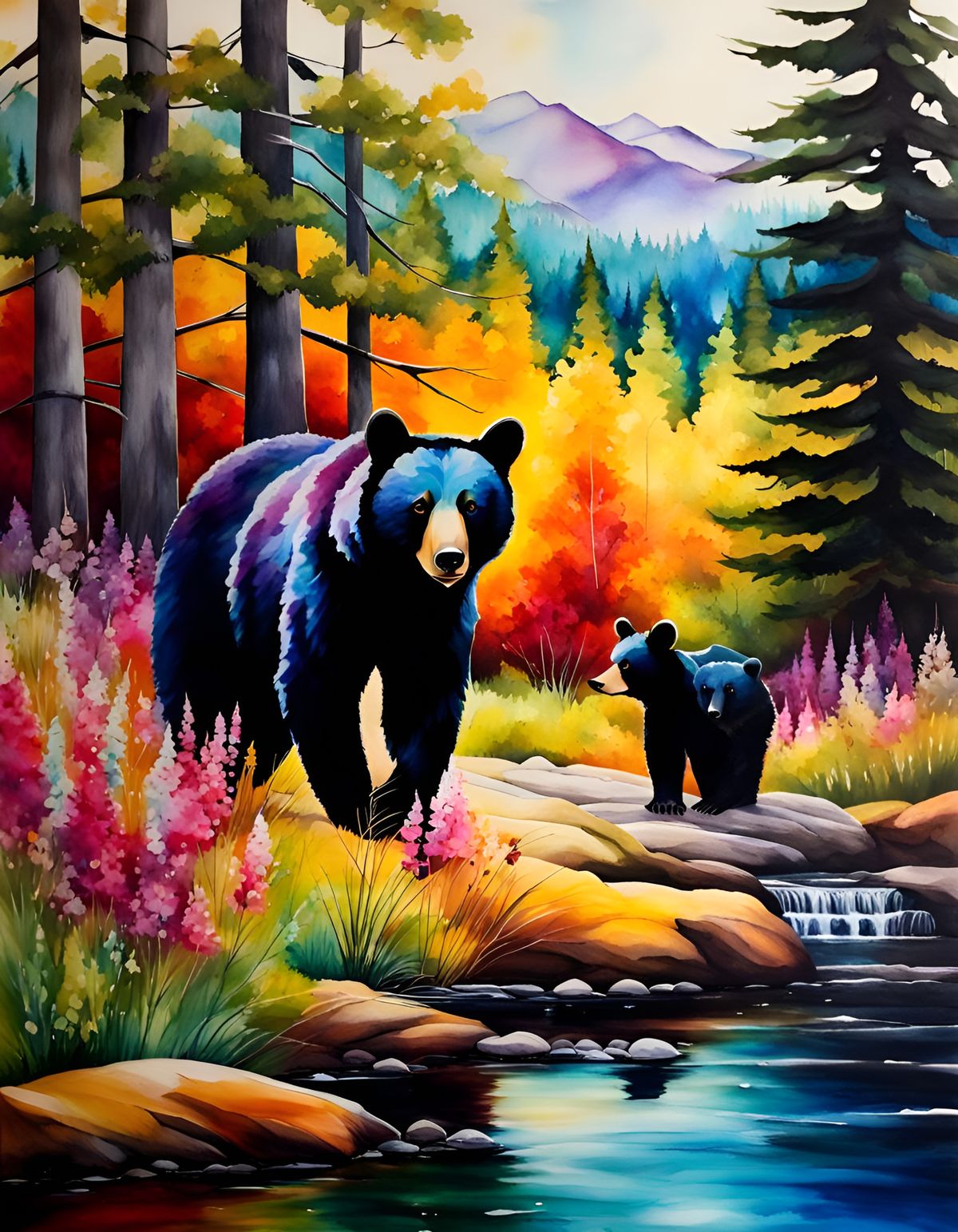 This alcohol ink landscape painting captures a black bear and its cub playing in a sunlit yard beside a woodland cabin.