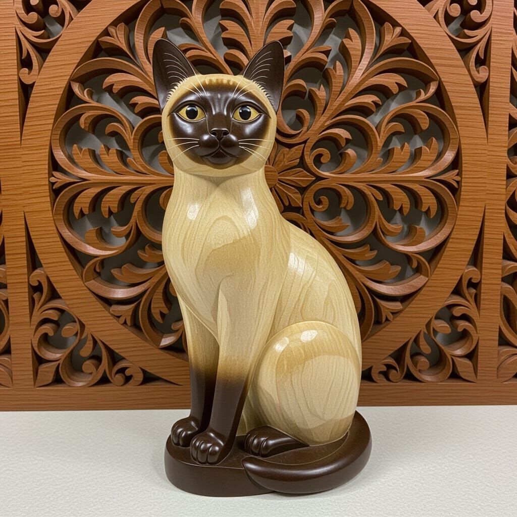 This image shows a wood carved Siamese cat statue. The carving features a detailed wooden background, complementing the sleek and elegant form of the cat in a naturalistic style.