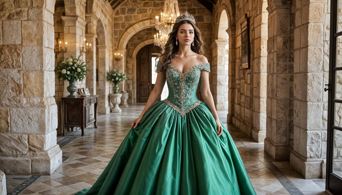 This image shows a beautiful, realistic full-body portrait of a princess with black hair, standing in a grand castle hall. She wears an elegant green gown and detailed jewelry, captured in soft, magical lighting.