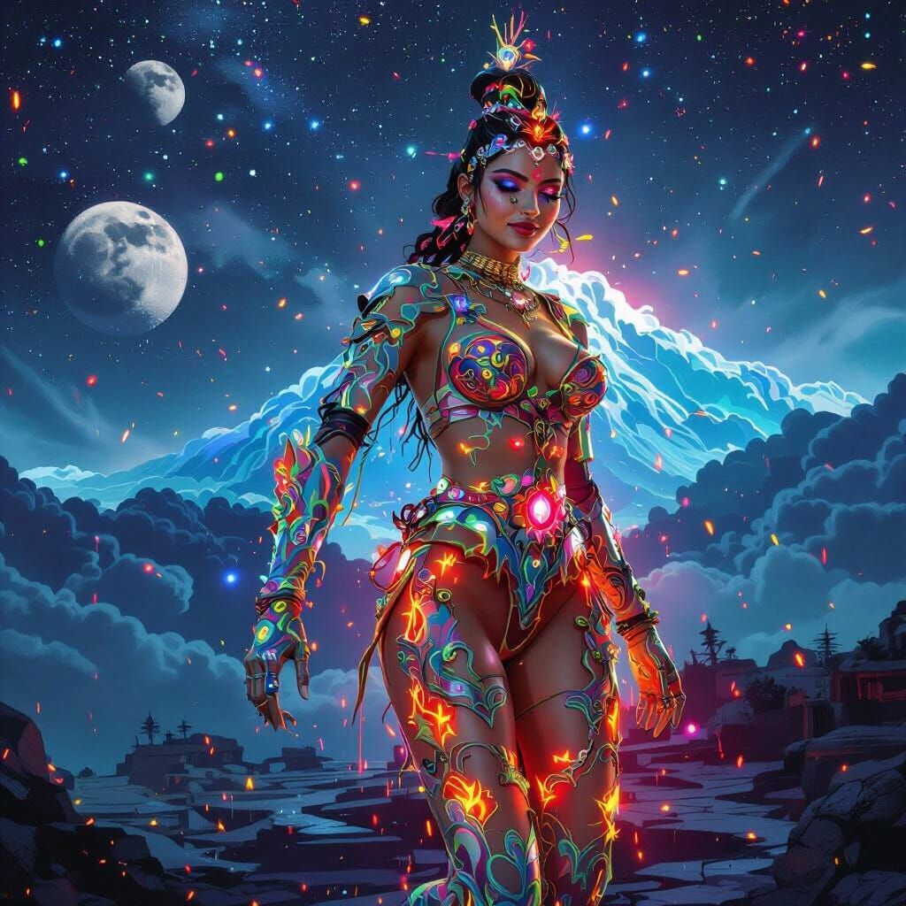 This image shows a woman in flowing neon garments dancing in the clouds. Sparks fall from her head as she transforms into a demoness, rendered in a vibrant graffiti and splash art style.