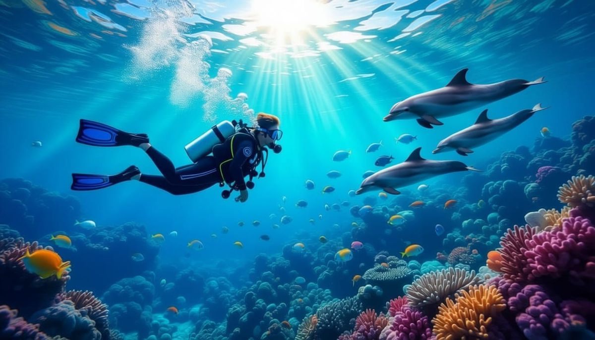 This image shows a scuba diver discovering a lively coral reef teeming with diverse tropical fish and sea creatures in a colorful underwater scene.