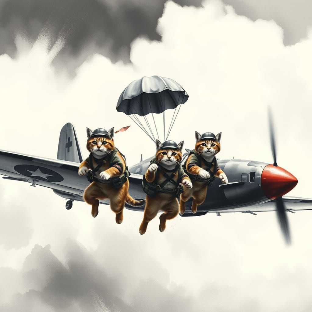 This dramatic black and white image captures the whimsical moment when miniature feline soldiers leap from a vintage World War II aircraft, their parachutes deploying in mid-air, with bold brushstrokes and textures reminiscent of classic war photographers and comic book artists.