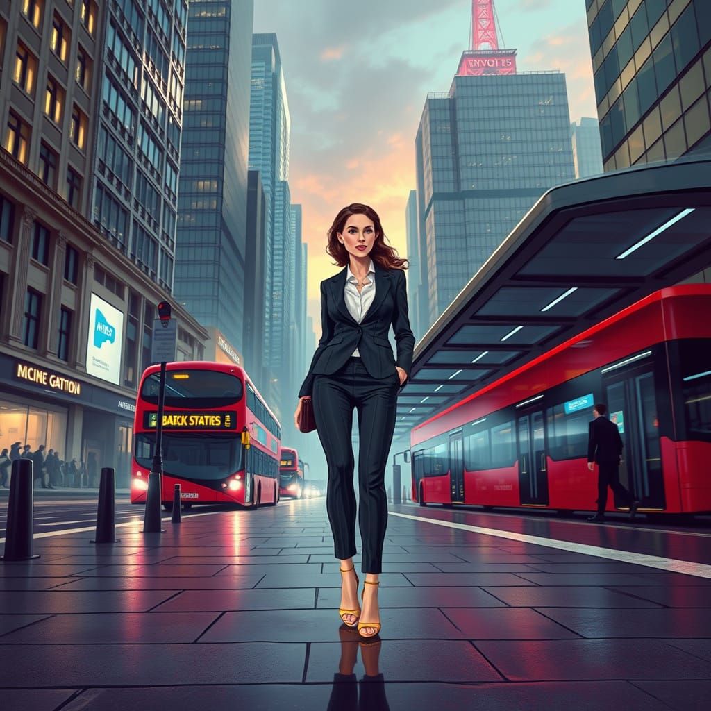 A captivating image of a businesswoman in London's financial district. The artwork features sleek skyscrapers and a bustling atmosphere, rendered with vibrant colors and a futuristic aesthetic.
