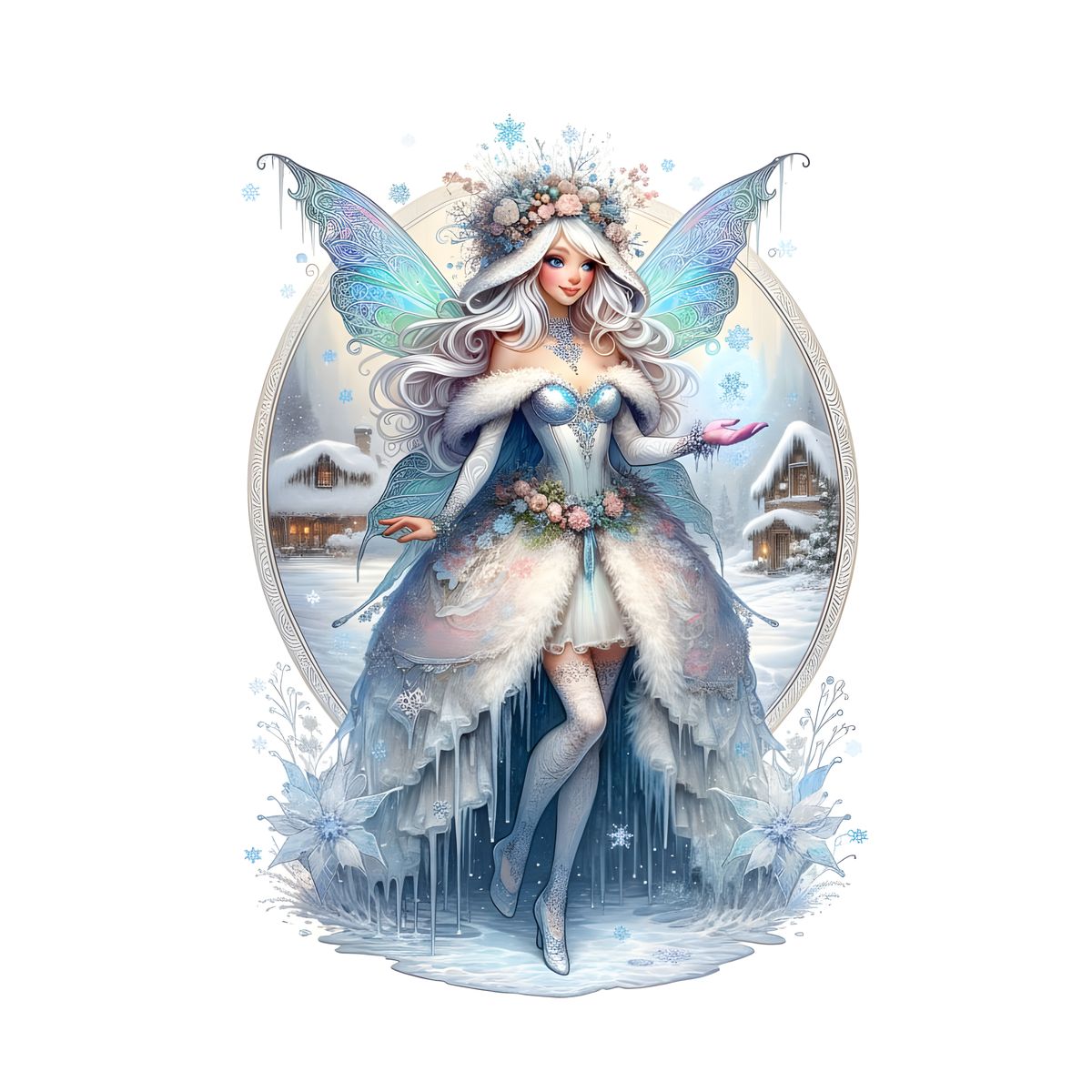 This image depicts the January fairy, a figure of ice and snow who guards villagers from the cold. Her magical warmth offers protection to those who stray too far from home.