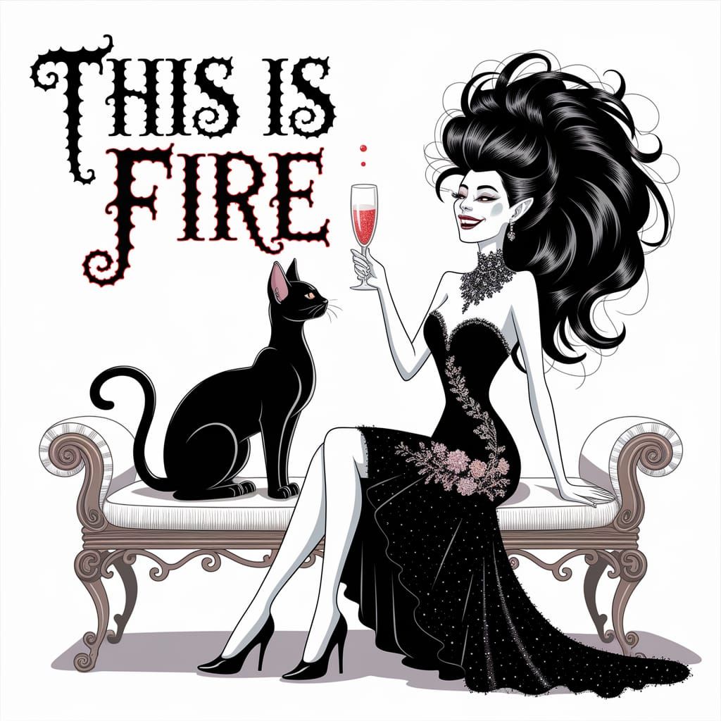 This image shows a gothic vampire bride in a romantic, ethereal setting, surrounded by soft light and ornate details. She's dressed in a delicate, beaded wedding dress with a long veil, and sits with her regal black cat by her side, smiling and holding a champagne glass in a toast.