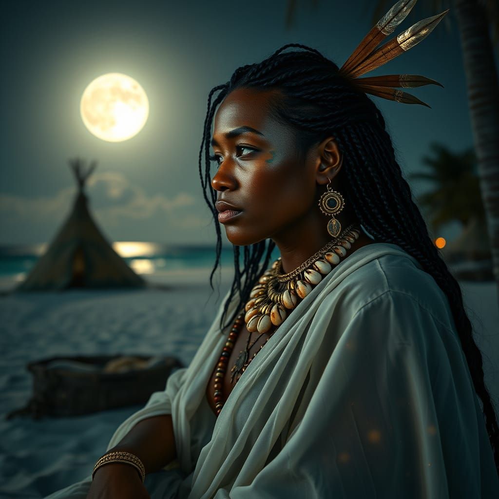 portrait artistique, photographique et hyperréalisme d'une très belle esclave iroquoise, à la longue chevelure noire comme l'ivoire ornée de colliers de coquillages entremêlés dans sa chevelure. et de splendides boucles d'oreilles en or. Elle a la peau laiteuse, ornée de marques tribales scintillantes ...