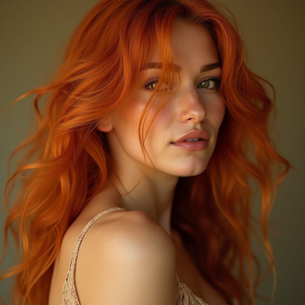 A portrait of a woman with amber colored hair, eyes, and skin, posing naturally. The image is rendered with art nouveau influences, and a warm color palette.