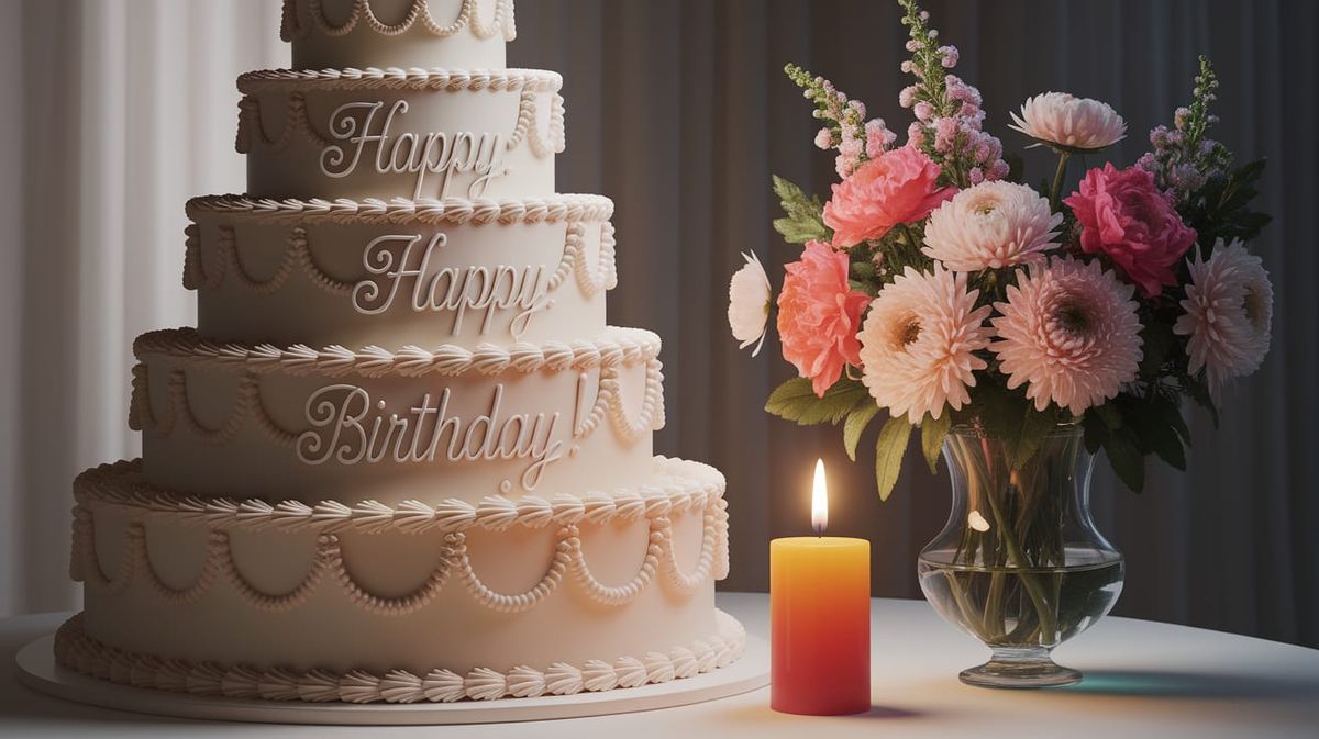This image showcases a stunning multi-story birthday cake with intricate frosting designs and a single glowing candle, surrounded by vibrant flowers and soft ambient lighting, creating a warm and inviting atmosphere.