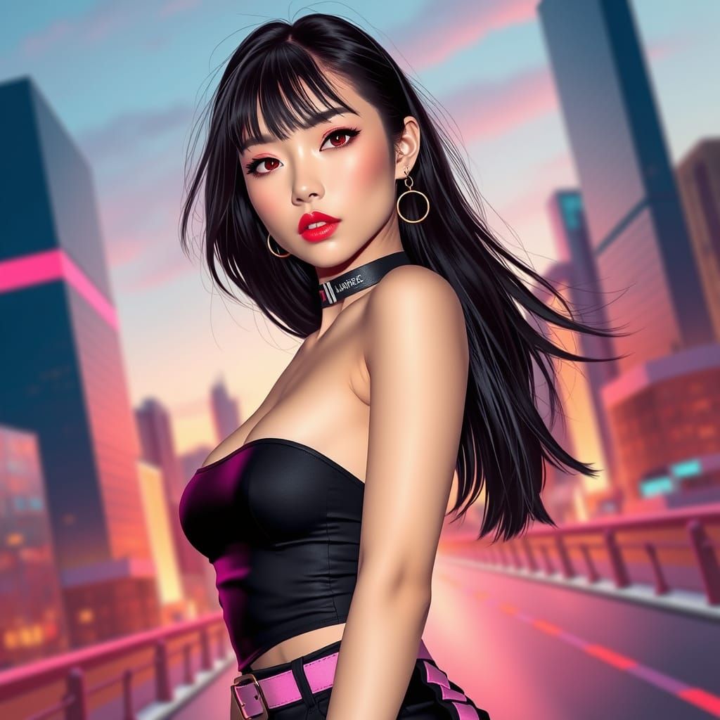 This image shows a young woman posing confidently in a futuristic cityscape at dusk, wearing a bold outfit with a mix of black and pink hues, evoking the styles of Ayami Kojima, Syd Mead, and Takeshi Obata.