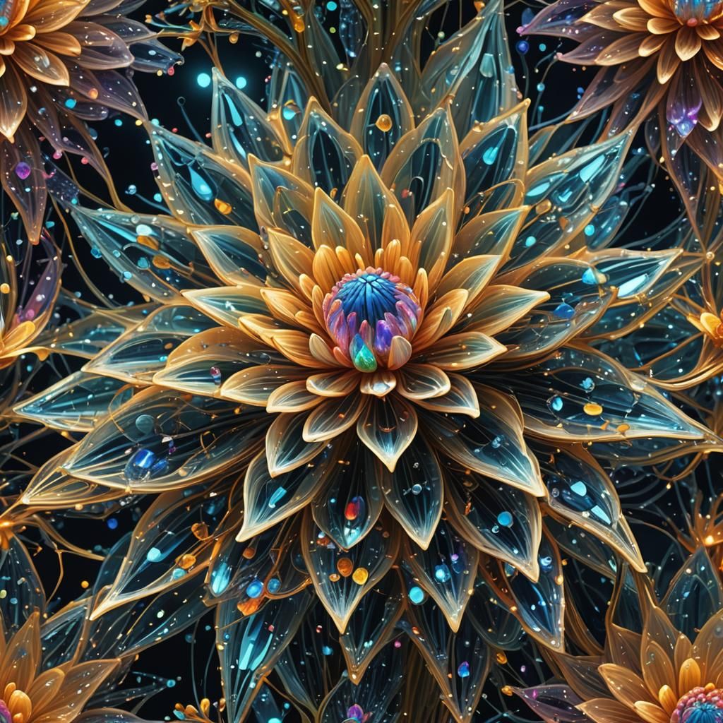 This image shows a flower formed from color-shifting crystals. Bioluminescent illumination and glow effects enhance the intricate design, presented in high detail as digital art.