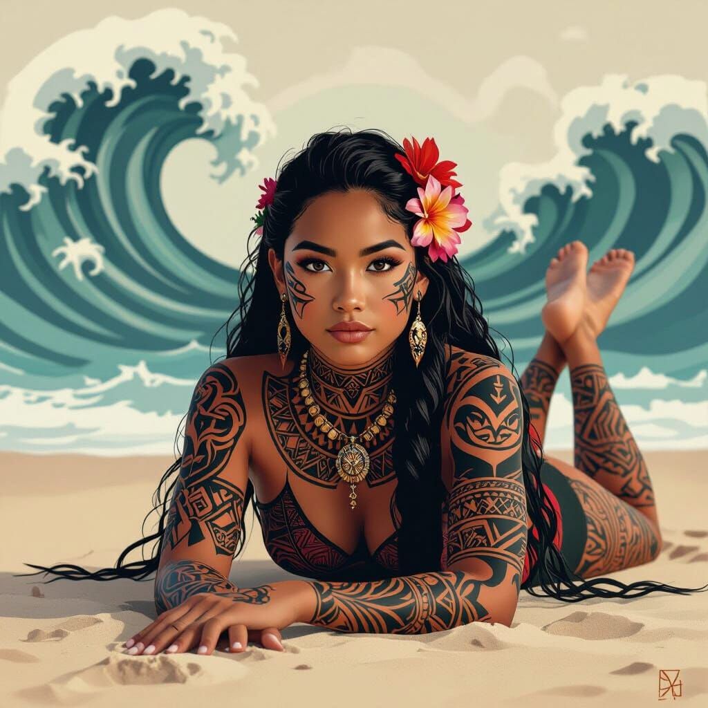 This image depicts a Maori girl with traditional full-body tattoo art lying on a beach. The background features an abstract wave pattern with dark, muted colors and subtle glows in a futuristic style.