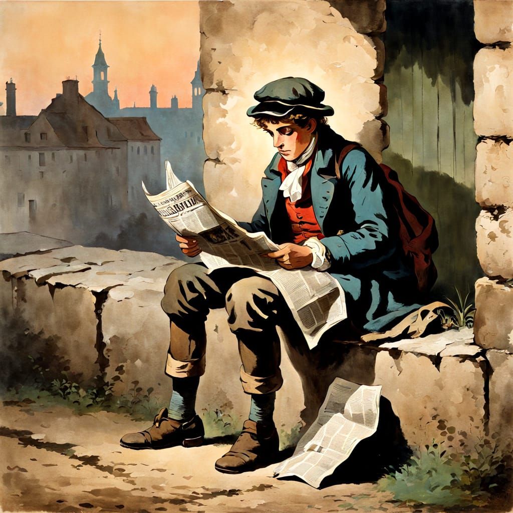 This image shows a boy reading a newspaper while sitting against a wall. The scene evokes a vintage, 18th-century aesthetic with an evening backdrop.