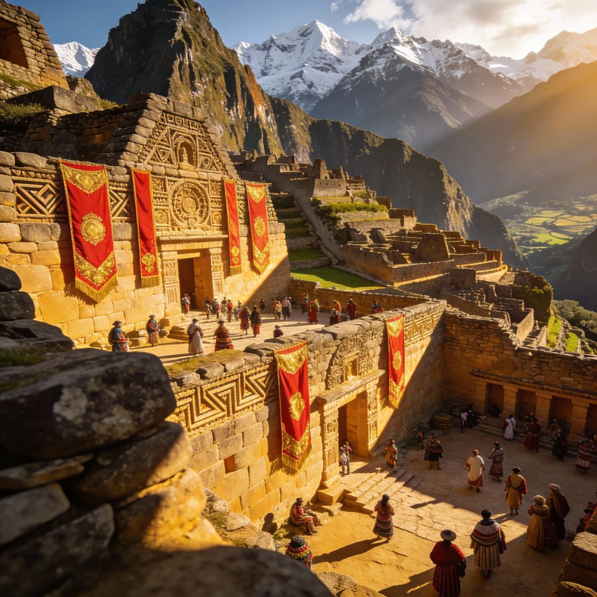 A photorealistic close-up of Machu Picchu reimagined as a bustling Inca acropolis at golden hour. Vibrant banners and dynamic lighting highlight intricate stonework and Andean landscapes.