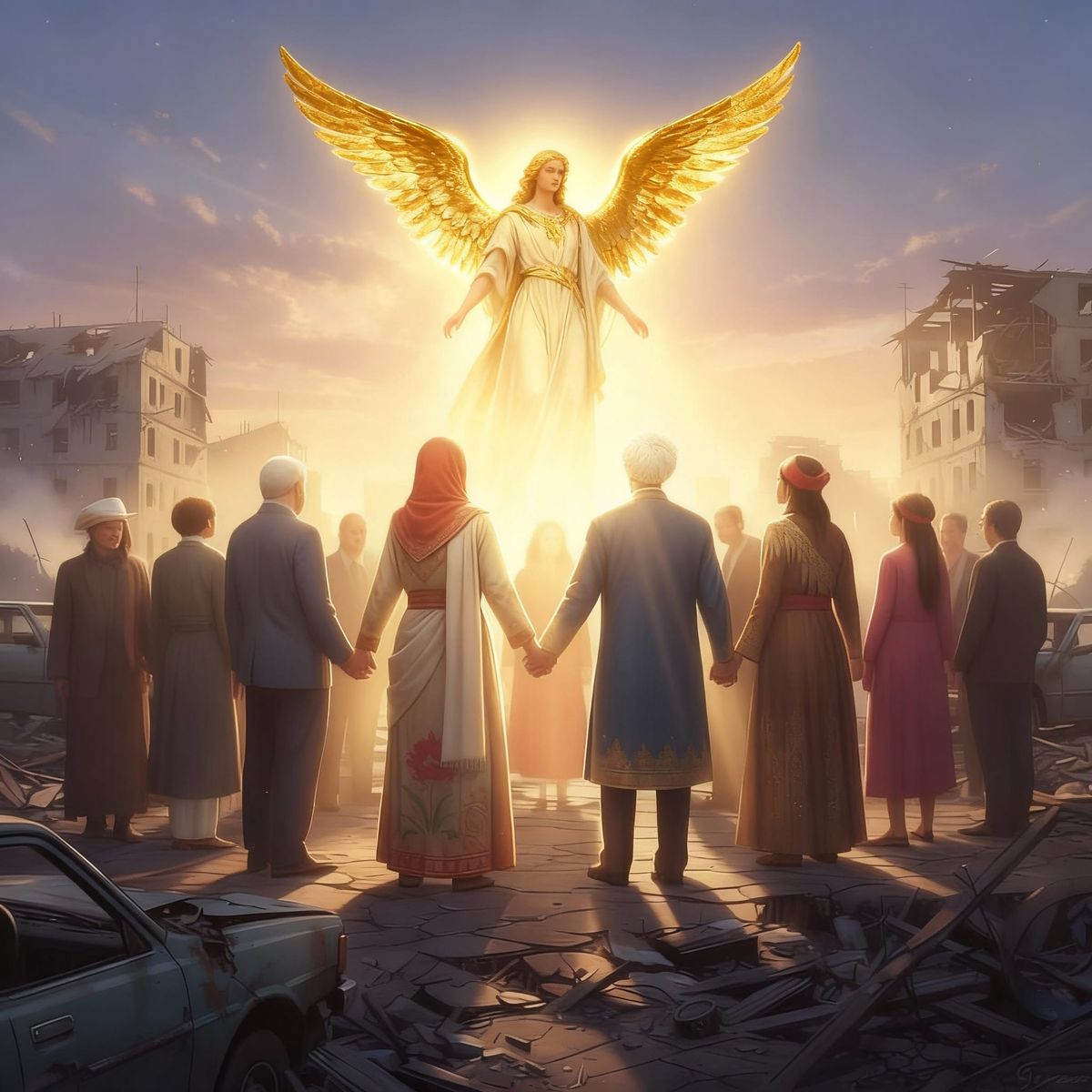 A diverse group in various national attire stands united in a war-ravaged land, holding hands and gazing at a hopeful light. This is an epic, cinematic digital matte painting.