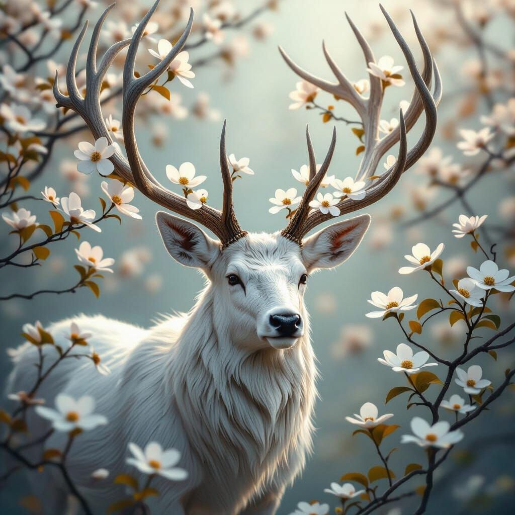 A striking picture of a white stag with dogwood flowers in its antlers. This digital artwork is rendered in ultra-high detail with cinematic lighting and a vibrant color palette.
