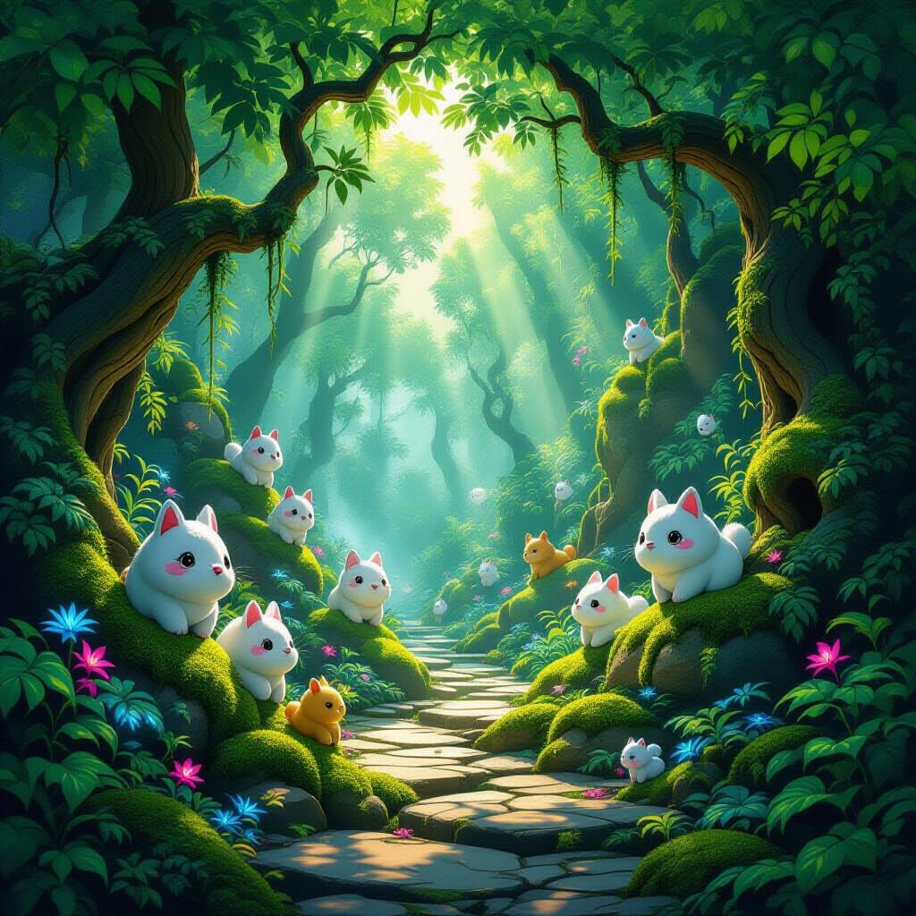 This image shows a majestic jungle alleyway filled with charming, realistic fantasy creatures. Sunlight and bioluminescent plants create an ethereal glow on ancient trees and mossy paths. Rendered in a detailed digital matte painting style with vivid colors and whimsical wonder.