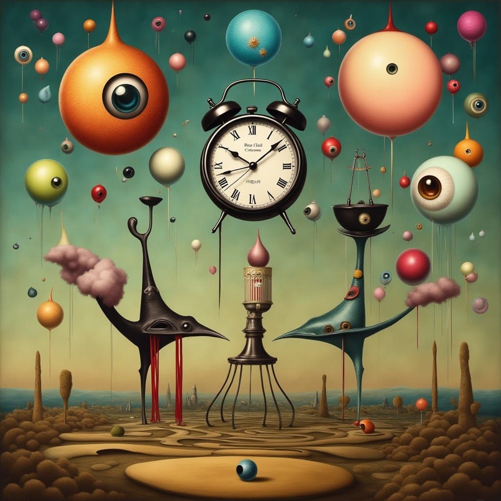 This striking artwork blends surrealist elements with a dash of metaphysical ambiance, featuring a melting clock and a pipe amidst a dreamlike backdrop, evoking emotions of pain and social commentary with a vibrant color palette.