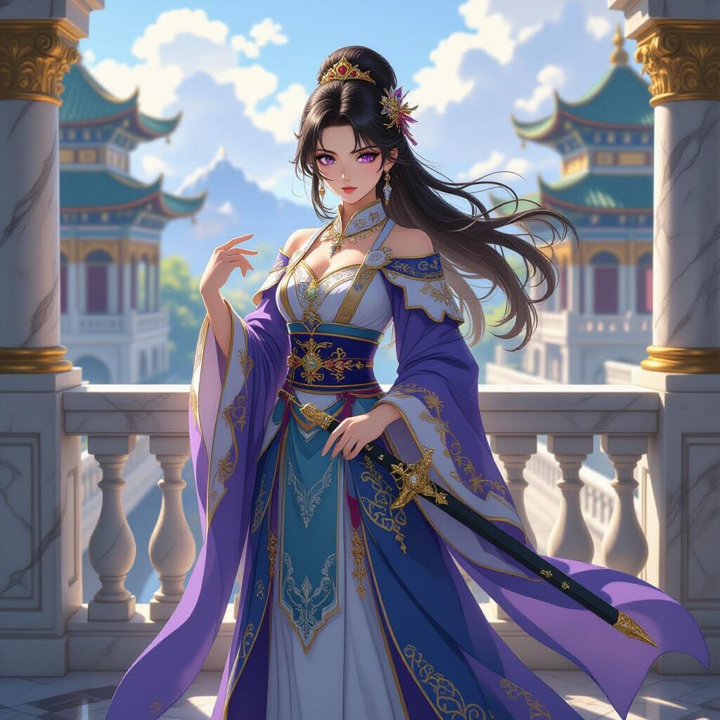 This image shows a young empress with violet eyes in flowing robes standing on a palace balcony. She has one hand on a jeweled dagger, and the scene is rendered in an anime style with dramatic lighting.
