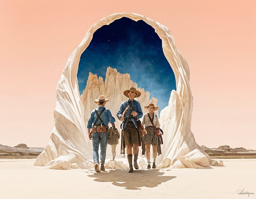 A man looks at the viewer with suspicion, his hand resting on his gun, in a scene reminiscent of Australian tonalism, characterized by triadic colors and diffuse light.
