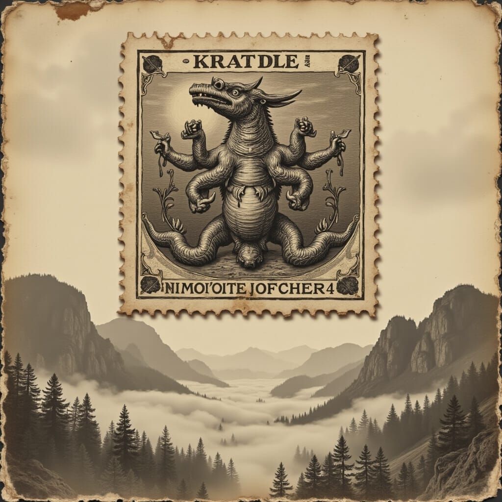 This image shows a gigantic, weathered postage stamp with a mythical creature hovering over a misty landscape. The artwork blends neon aesthetics with painterly elements, creating a hyper-detailed, vintage-style scene.