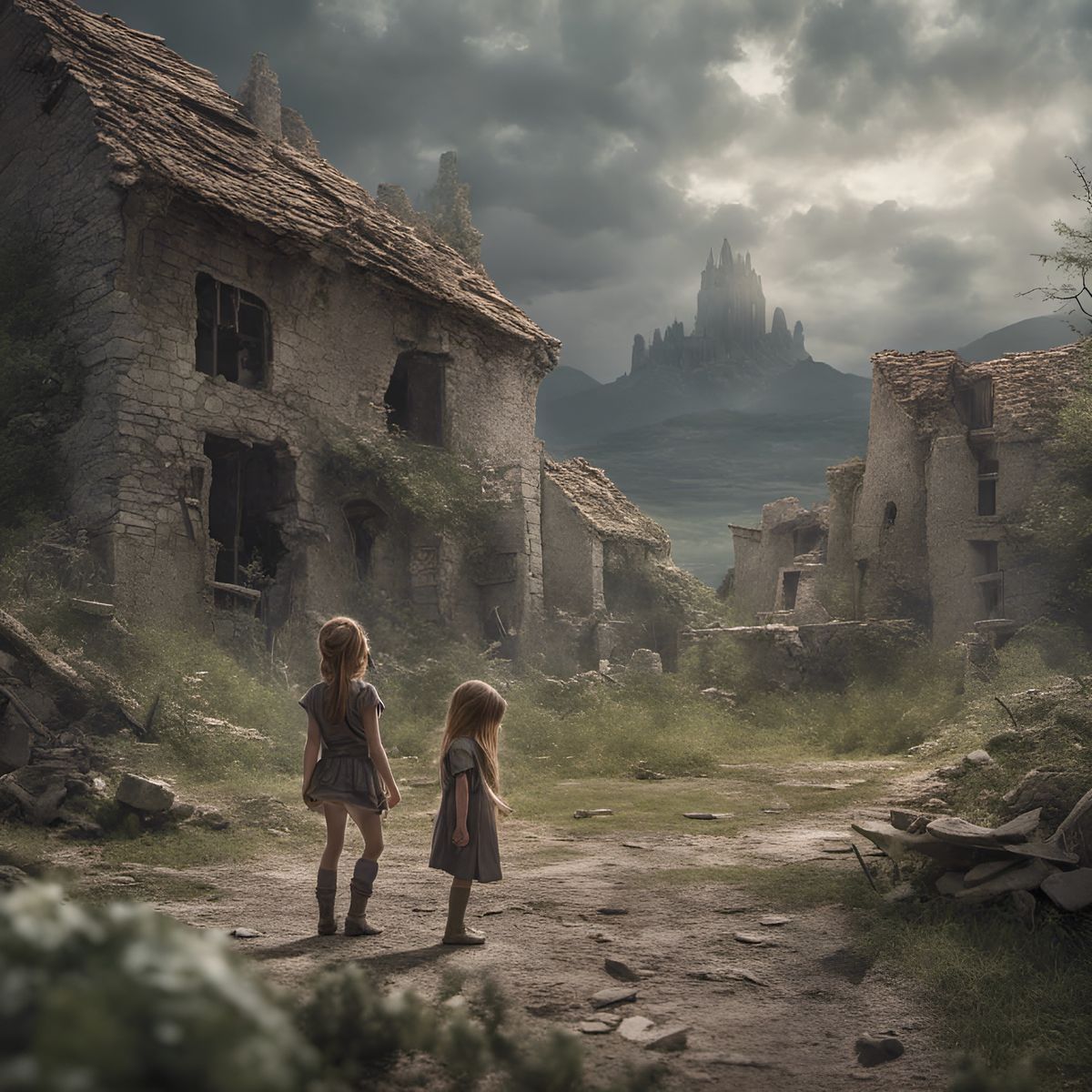 Professional photography, a little girl lose her mother in attack, ruine village in background, despair, natural lighting, canon lens,...
