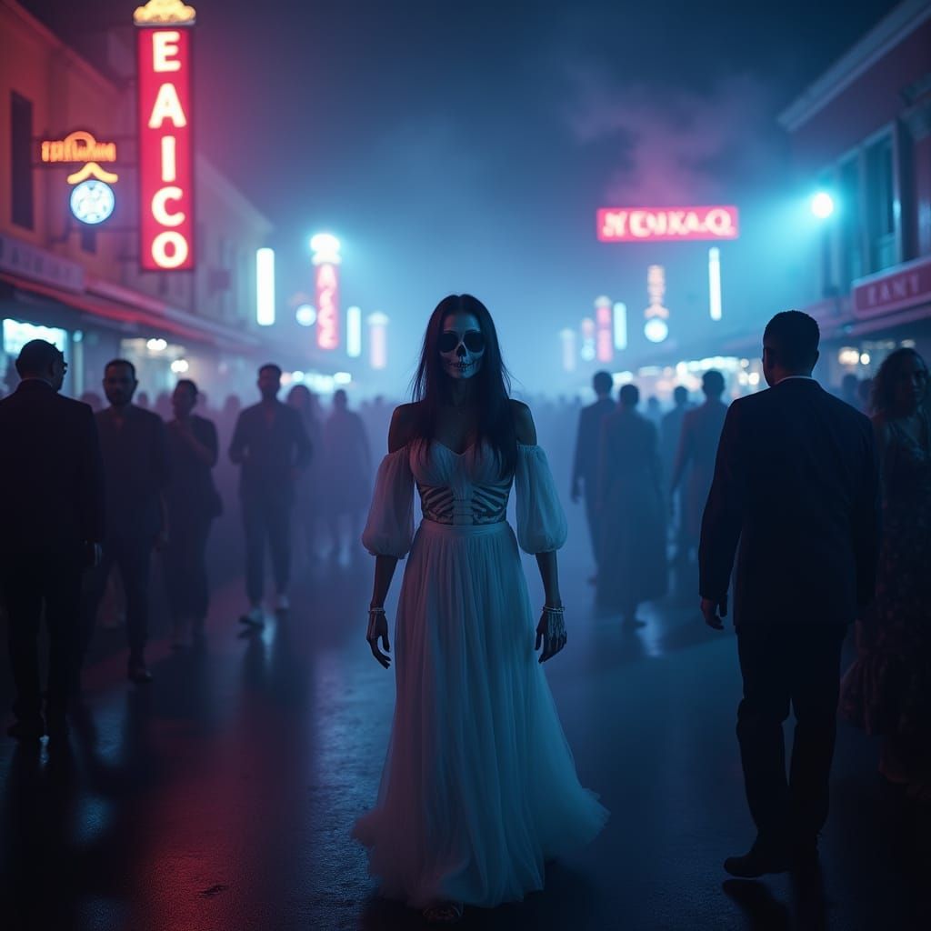 This image shows a vibrant Day of the Dead parade scene on a busy Mexican street at night. The scene is lit with colorful neon lights and features a mysterious figure in a flowing white dress, painted as a skeleton, in a cinematic, noir aesthetic.