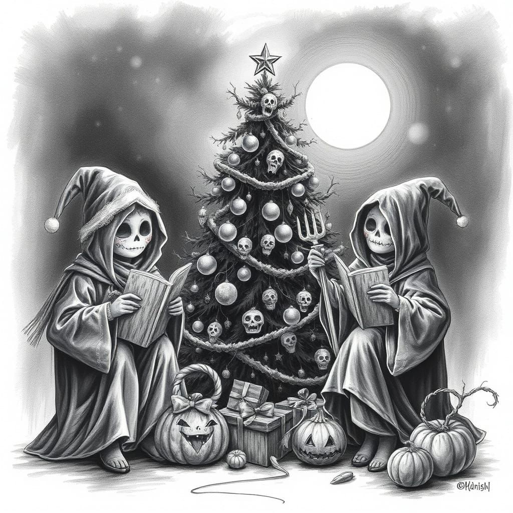 This image depicts a unique blend of Christmas and Halloween themes, featuring undead carolers and haunted gifts. It is rendered as a hyperdetailed charcoal drawing.