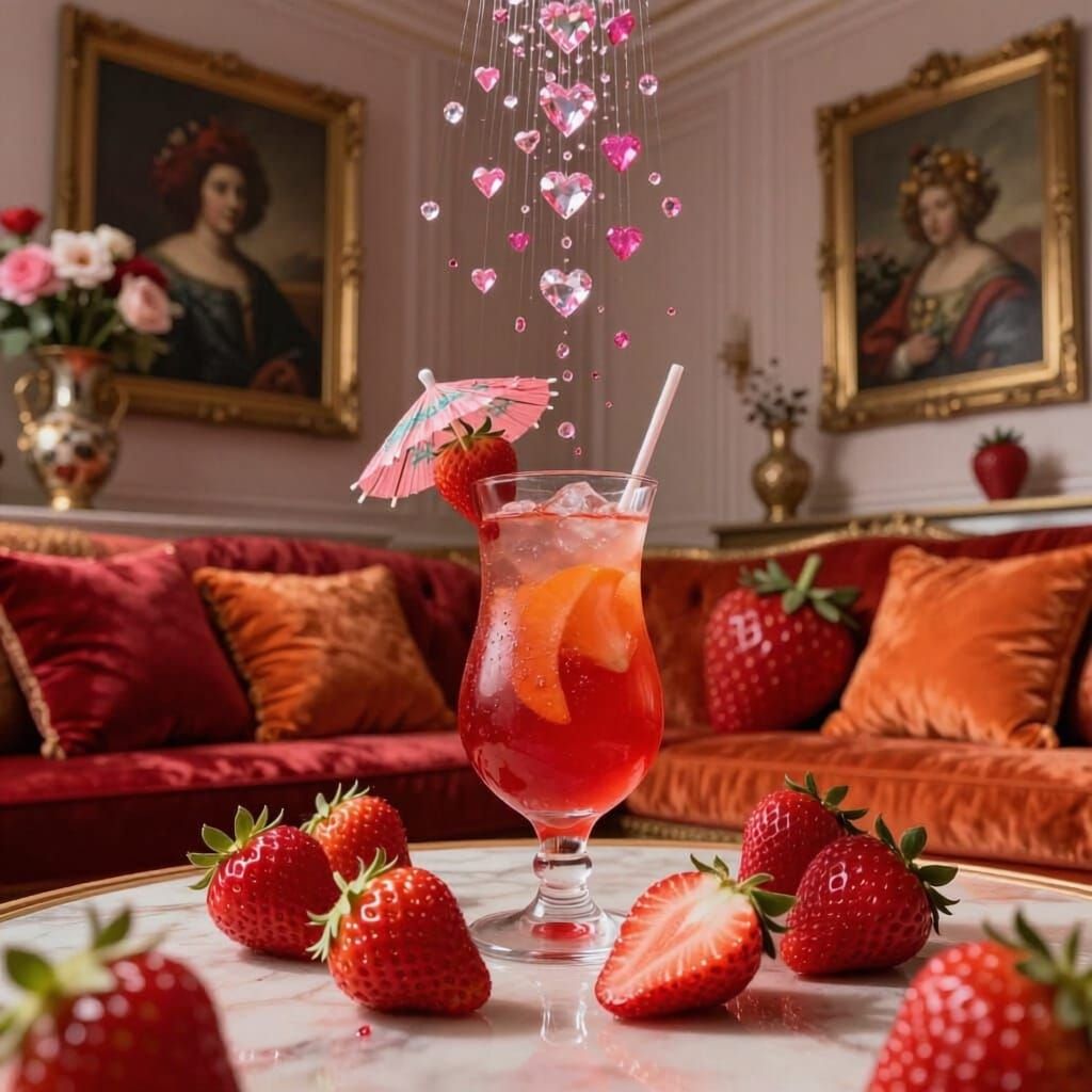 This image displays glowing strawberries, both whole and sliced, alongside tropical alcoholic drinks. Accents of red and orange create a vibrant living room theme with falling pink and red diamond hearts.