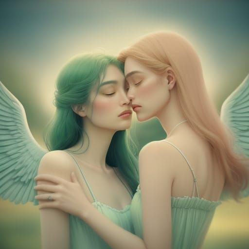 A close-up image shows two women in a deep kiss, rendered in soft focus and dreamy pastel colors. The scene features softly blurred wings, warm golden lighting, and a tender, romantic ambiance.