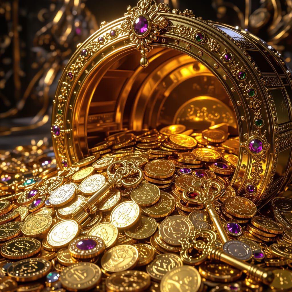 This hyperrealistic image shows a golden vault filled with shimmering coins and precious gems, symbolizing future wealth and prosperity. Features cinematic, moody lighting and sharp focus.