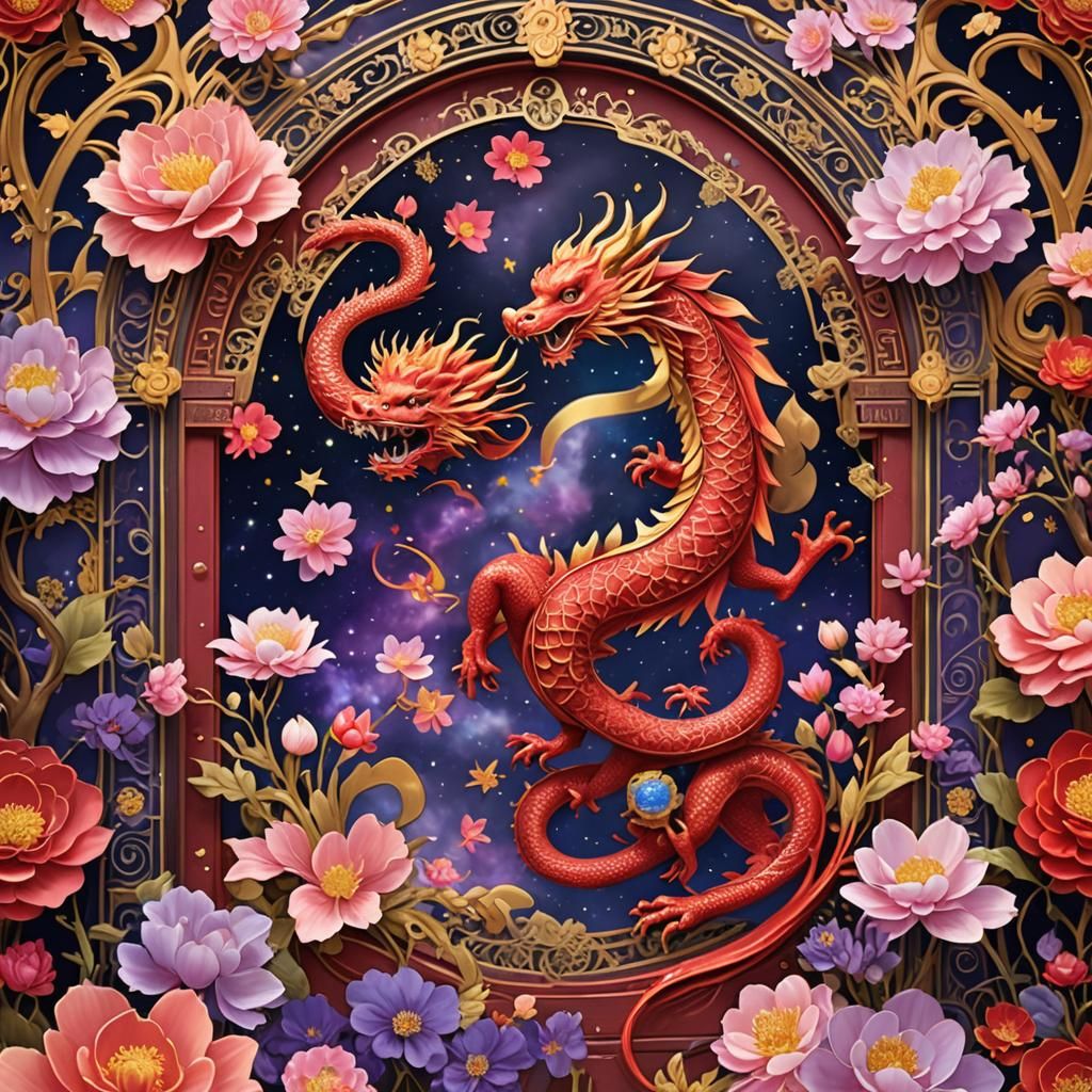 A striking picture of a vibrant red fire dragon in an Art Nouveau style. The dragon opens a constellation door amidst flowers and cosmic elements, evoking a surreal, heavenly fantasy.
