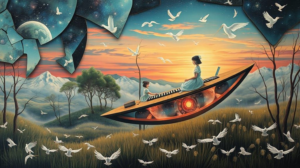 A surreal landscape featuring rippling forests and glowing creatures in a dreamlike scene. The image evokes a mystical realm with fragmented mirrors and white birds, rendered with bold colors and intricate textures.