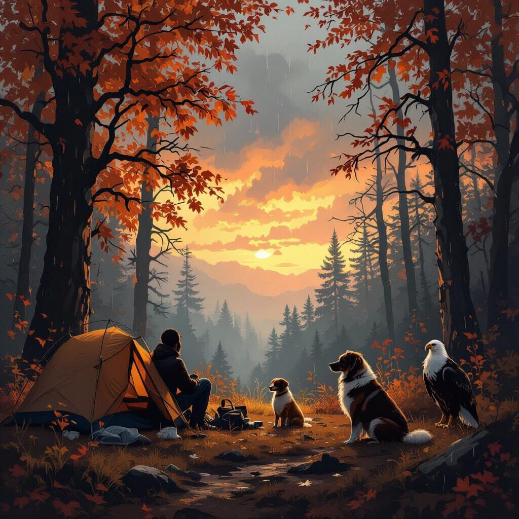 A person relaxes with dogs and an eagle in a dense, moody autumn forest under a dark, rainy sky. Features cinematic, painterly style with visible brushstrokes and rich colors.