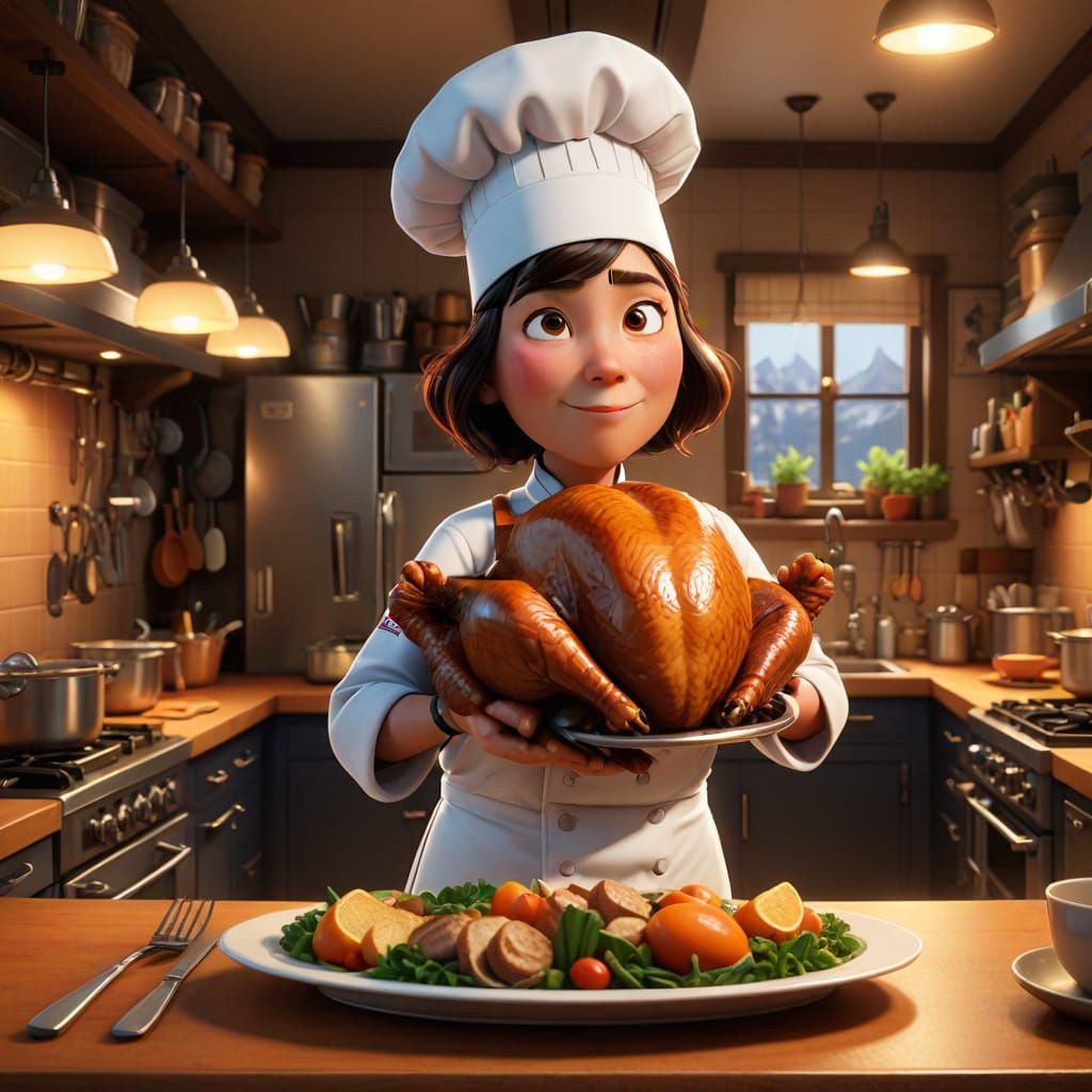 This image shows a cartoon chef, reminiscent of classic animated characters, proudly presenting a perfectly cooked turkey in a warm and inviting kitchen. The scene is rendered in the signature style of Pixar, with rich colors and dynamic composition.