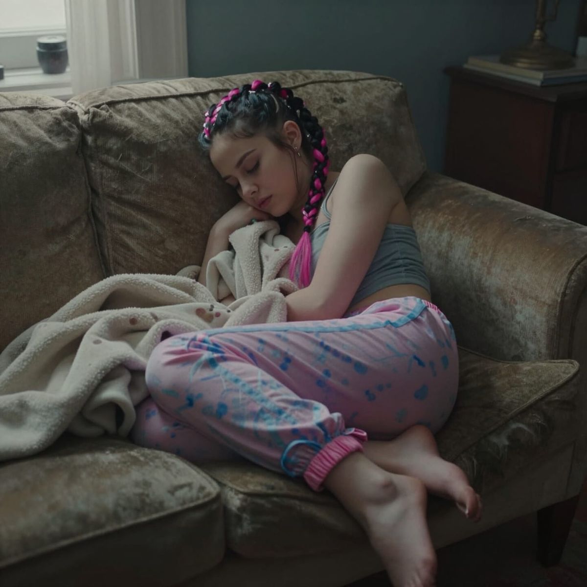 This cinematic image shows a punk girl with braided hair sleeping on an old couch. Her grandmother covers her with a blanket, captured with atmospheric lighting and film grain for a dramatic effect.