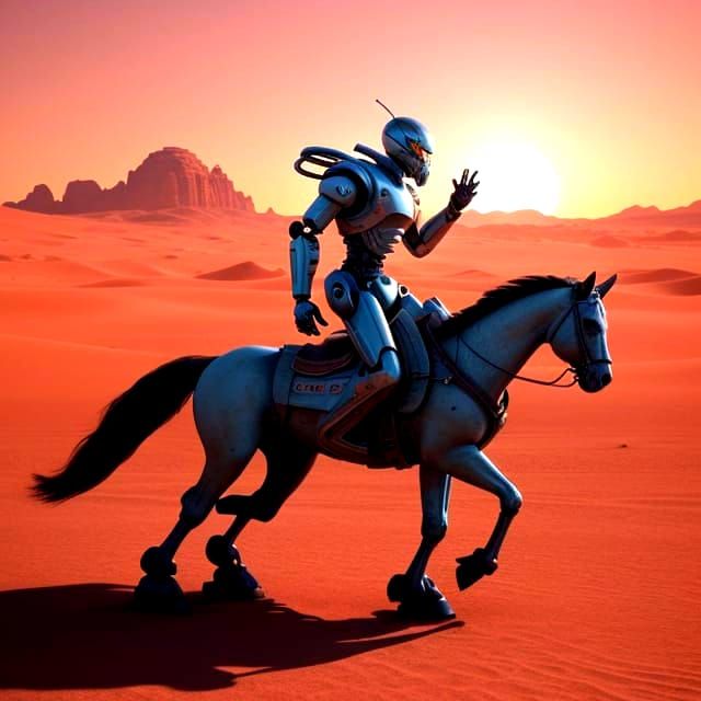 A hyperrealistic image shows a robot cowboy riding a metal horse across an alien desert. A cinematic, wide shot captures a cosmic, pink-tinted sunset in a sci-fi landscape.