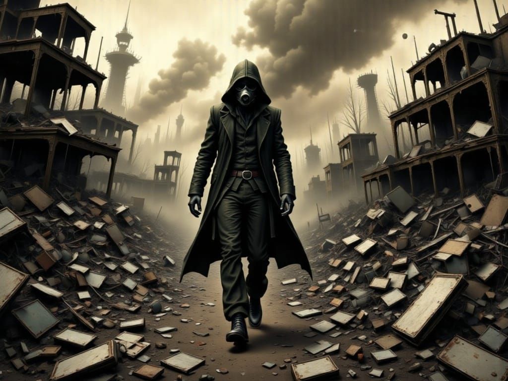 A highly detailed, realistic image of a plague doctor in a desolate wasteland, surrounded by burning buildings and smoke. The scene uses deep, neutral colors, evoking a sense of decay and destruction.