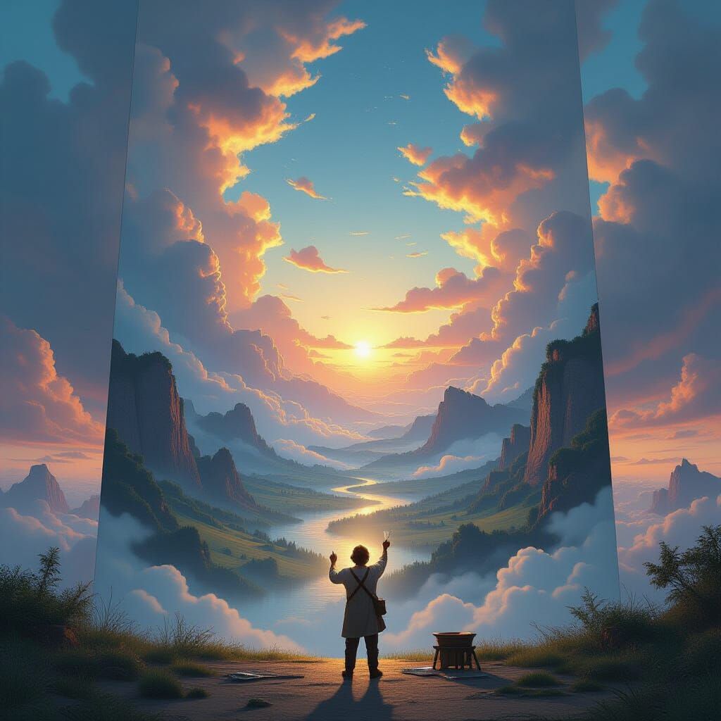 A digital matte painting of an infinite canvas filled with dynamic skies and landscapes. A lone painter creates a glowing masterpiece that reshapes reality in this surreal, detailed artwork.